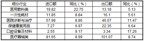 上半年,我國醫(yī)療器械進出口貿易呈現(xiàn)出進出口同比大幅增長的良好勢頭,進出口總額達到182.73億美元,同比增長8.85%;其中進口81.65億美元,同比增長8.99%;出口額為101.07億美元,同比增長8.74%,明顯高于我國醫(yī)藥工業(yè)整體貿易增幅。