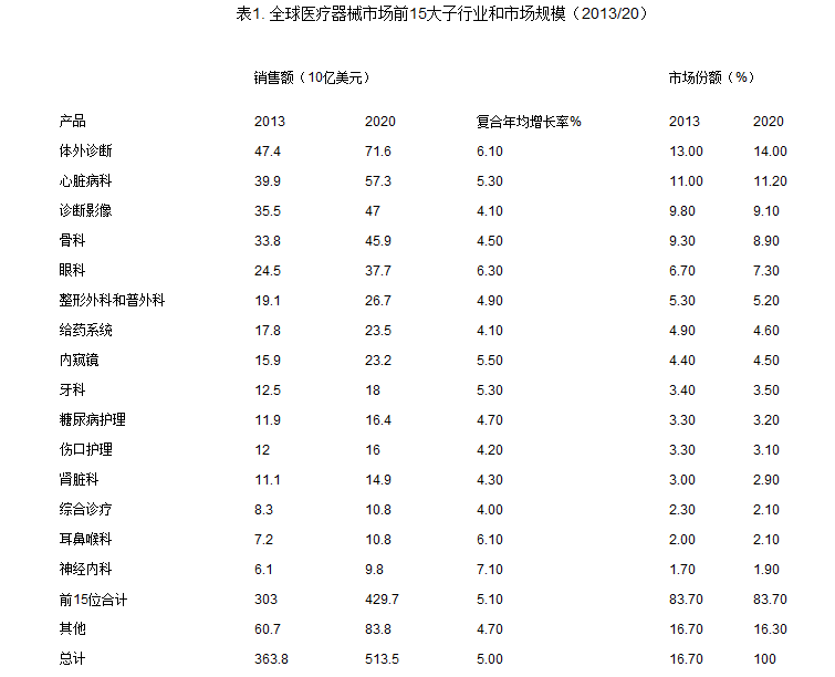 預計2013~2020年,全球處方藥市場將以5.3%的復合年均增長率增長,高于醫(yī)療器械行業(yè)的5%,但在2010~2013年,醫(yī)療器械市場的發(fā)展速度卻遠超處方藥市場。隨著專利懸崖的到來和人們對生物科技產(chǎn)業(yè)信心的增強,2014年及2016年以后,處方藥市場發(fā)展速度得以超過醫(yī)療器械,這一現(xiàn)象致使到2020年醫(yī)療器械市場占處方藥市場的比率下降到49.7%,2013年此比率為50.3%。