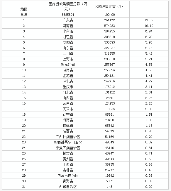 2015年31省醫(yī)療器械類區(qū)域銷(xiāo)售金額排行榜