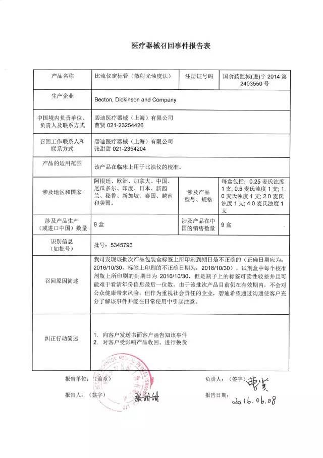 3、碧迪醫(yī)療器械(上海)有限公司對(duì)比濁儀定標(biāo)管(散射光濁度法)主動(dòng)召回