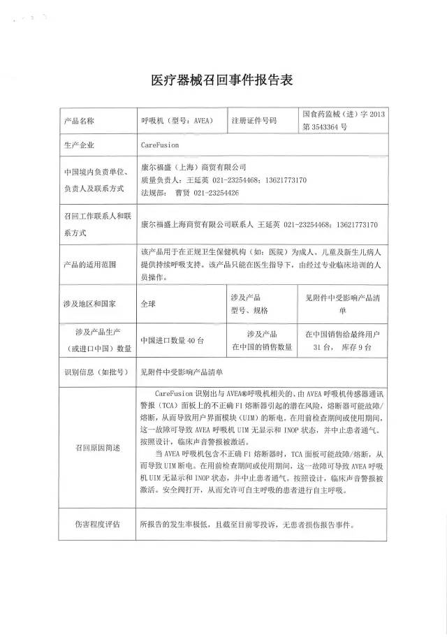 9、康爾福盛(上海)商貿(mào)有限公司對(duì)呼吸機(jī)主動(dòng)召回