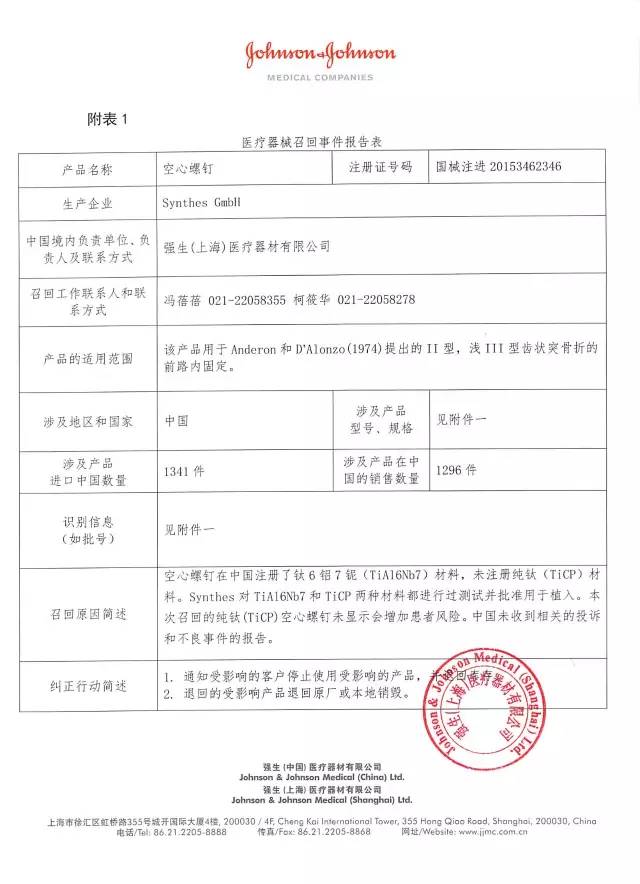 強(qiáng)生(上海)醫(yī)療器材有限公司報(bào)告:公司未注冊(cè)純鈦材料的空心螺釘,上市銷售純鈦材料的空心螺釘不符合中國法規(guī)。公司主動(dòng)召回相關(guān)產(chǎn)品。召回級(jí)別為III級(jí)。涉及產(chǎn)品的型號(hào)、規(guī)格及批次等詳細(xì)信息見《醫(yī)療器械召回事件報(bào)告表》。