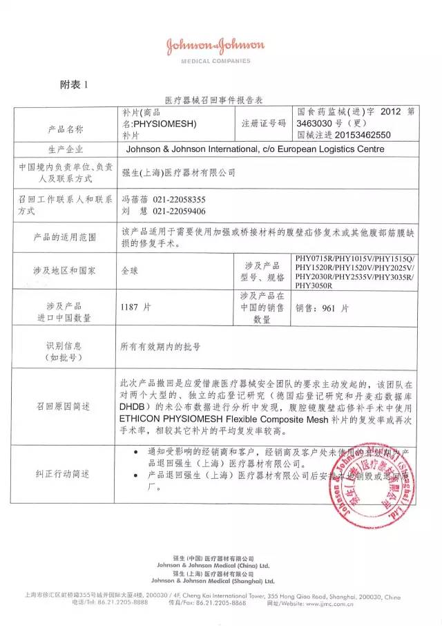 14、強(qiáng)生(上海)醫(yī)療器材有限公司對(duì)補(bǔ)片主動(dòng)召回