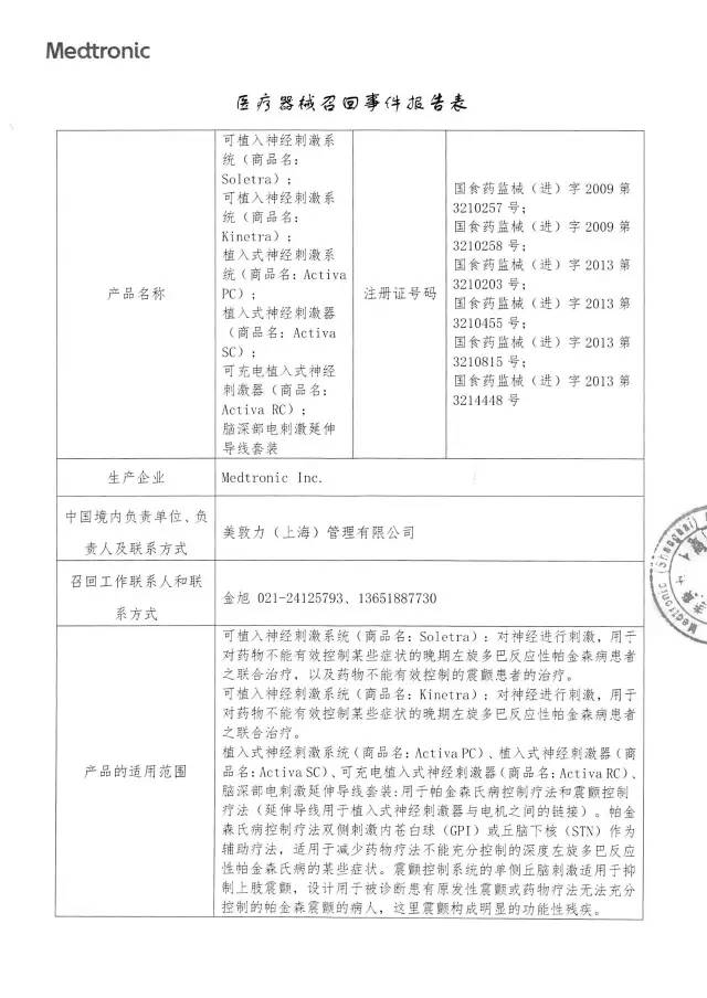 1、美敦力(上海)管理有限公司對(duì)可植入神經(jīng)刺激系統(tǒng)、植入式神經(jīng)刺激系統(tǒng)、植入式神經(jīng)刺激器、可充電植入式神經(jīng)刺激器、腦深部電刺激延伸導(dǎo)線套裝主動(dòng)召回