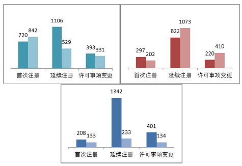 按注冊(cè)形式區(qū)分,首次注冊(cè)申請(qǐng)2402項(xiàng),延續(xù)注冊(cè)申請(qǐng)5105項(xiàng),許可事項(xiàng)變更申請(qǐng)1889項(xiàng)。