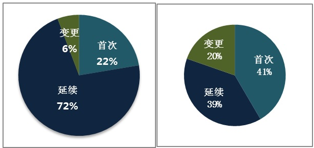 從注冊(cè)形式看,首次注冊(cè)申請(qǐng)1562項(xiàng),占40%;延續(xù)注冊(cè)申請(qǐng)1635項(xiàng),占42%;許可事項(xiàng)變更注冊(cè)申請(qǐng)724項(xiàng),占18%。