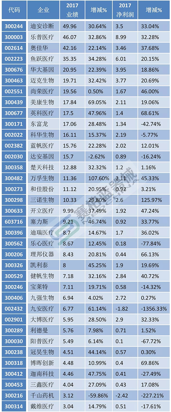 排在首位的是診斷產(chǎn)品渠道商——迪安診斷,2017年收入將近50億,為49.96億元,同比增長(zhǎng)30.64%,利潤(rùn)亦同比增長(zhǎng)超過(guò)30個(gè)百分點(diǎn)。主要得益于該企業(yè)能有效運(yùn)用資本市場(chǎng)工具,加大產(chǎn)融結(jié)合能力,增強(qiáng)市場(chǎng)發(fā)展能力。