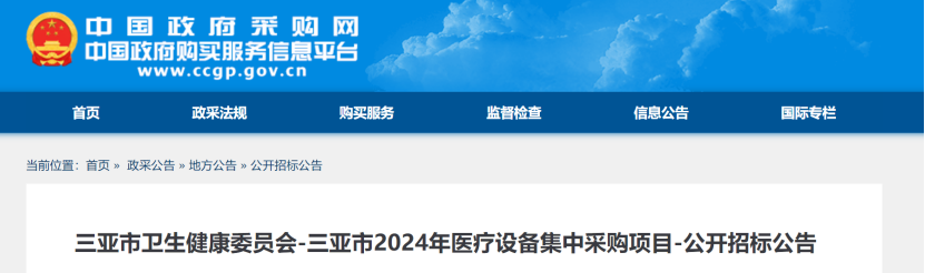 近日,中國政府采購網發(fā)布《三亞市衛(wèi)生健康委員會-三亞市2024年醫(yī)療設備集中采購項目-公開招標公告》。