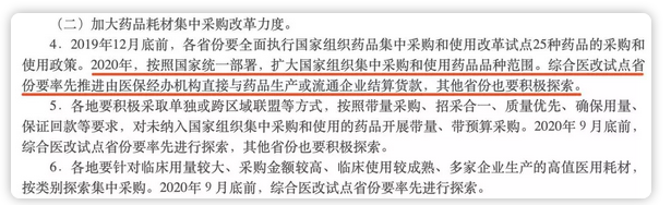 2020年,按照國家統(tǒng)一部署,擴大國家組織集中采購和使用藥品品種范圍。綜合醫(yī)改試點省份要率先推進由醫(yī)保經(jīng)辦機構直接與藥品生產(chǎn)或流通企業(yè)結算貨款,其他省份也要積極探索。