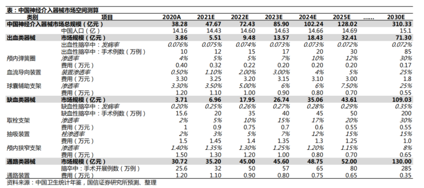 以神經(jīng)介入市場為例,國信證券研究報告顯示,預(yù)計2030年中國神經(jīng)介入醫(yī)療器械市場總規(guī)模將達到310億元。其中,出血類器械71億元、缺血類器械109億元,通路類器械130億元,比2025年均有翻倍以上增長。