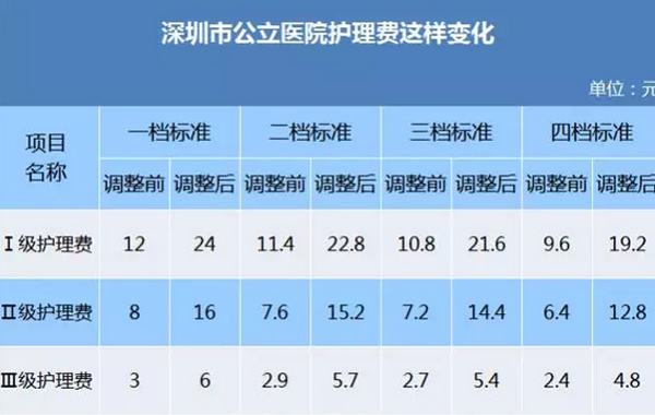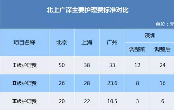 此次調價中,深圳對3項護理費全面提價,但仍低于北上廣的標準。