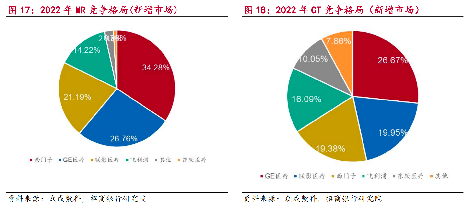 如聯(lián)影醫(yī)療在MR、CT、PET-CT領(lǐng)域?qū)崿F(xiàn)較大突破,2022年國內(nèi)市場份額分別達到21.19%、19.95%、28.48%,均位列細分領(lǐng)域前三。邁瑞醫(yī)療、開立醫(yī)療在超聲領(lǐng)域取得 24.93%、3.78%市場占有率,位列領(lǐng)域第 1、5 位。