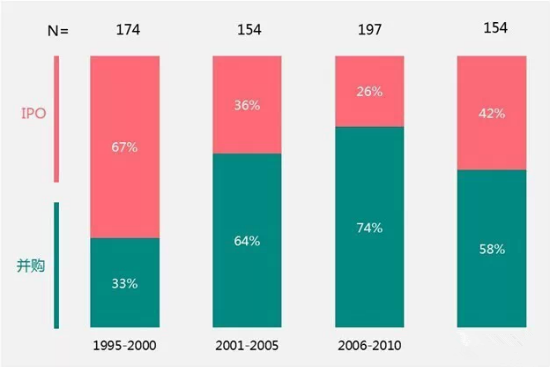 而2006-2010年段,在所有規(guī)模的風(fēng)投退出方式中,并購方式超過75%,盡管2013年IPO方式改寫了這一數(shù)字,但仍然未能撼動并購方式的主導(dǎo)地位,最近的幾年間,在大于2.5億美元的公司或項(xiàng)目中超過60%以并購方式退出,并購企業(yè)的含金量已經(jīng)大幅度提升。