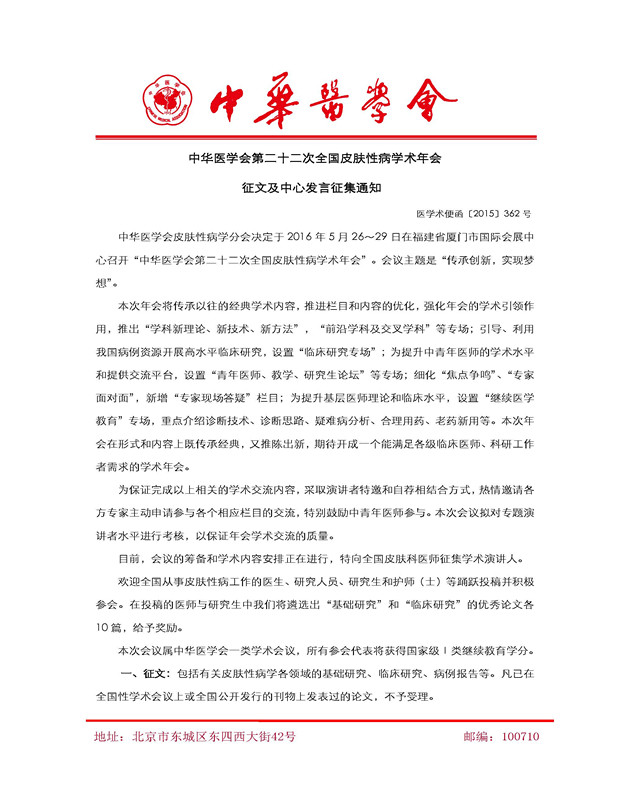 目前,會(huì)議的籌備和學(xué)術(shù)內(nèi)容安排正在進(jìn)行,特向全國皮膚科醫(yī)師征集學(xué)術(shù)演講人。
