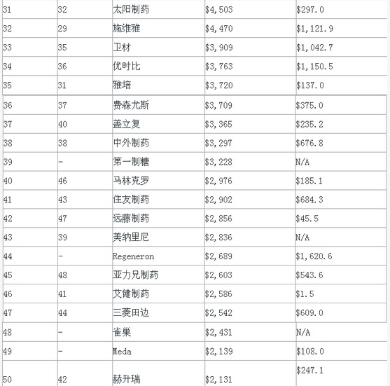 下面是今年的全球制藥企業(yè)TOP50榜單(單位:百萬美元):