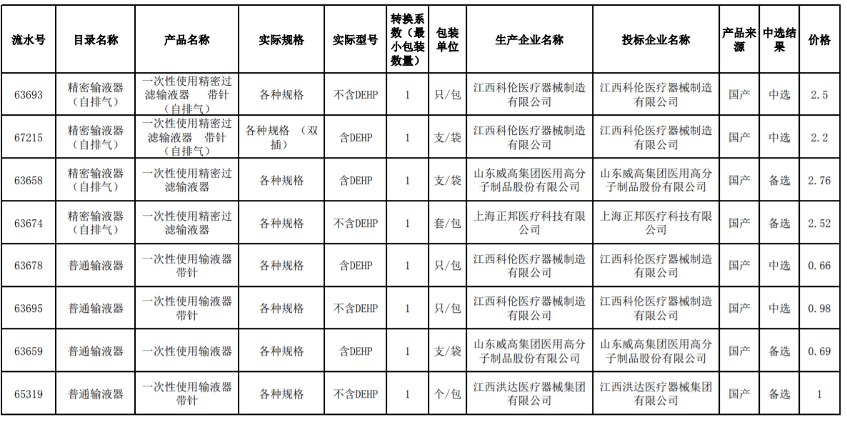 科倫醫(yī)療的某款精密輸液器(自排氣)中選價格為2.2元;