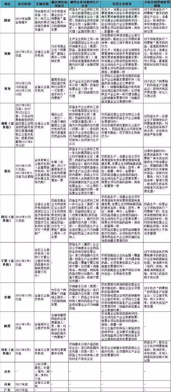 陜西:繼安徽之后,陜西也發(fā)文執(zhí)行兩票制,2017年1月1日起實施,目前已有一些醫(yī)院明確了執(zhí)行時間。相比安徽,陜西的動作顯得小一些,目前還未出臺具體實施細則,只有寶雞市發(fā)布了兩票制配送工作實施意見,自2016年12月1日起實施兩票制。