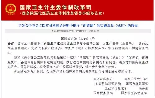 1月9日,國家衛(wèi)生計生委體制改革司(國務院深化衛(wèi)生體制改革領導小組辦公室)在衛(wèi)計委官網(wǎng)發(fā)布了印發(fā)《關于在公立醫(yī)療機構藥品采購中推行“兩票制”的實施意見(試行)》的通知,要求:自通知發(fā)布之日起,公立醫(yī)療機構新開展的藥品采購活動須按照本通知規(guī)定執(zhí)行。