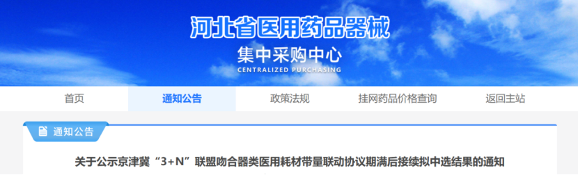 近日,河北省醫(yī)用藥品器械集中采購中心發(fā)布《關于公示京津冀“3+N”聯(lián)盟吻合器類醫(yī)用耗材帶量聯(lián)動協(xié)議期滿后接續(xù)擬中選結果的通知》。