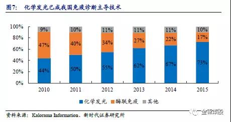 化學發(fā)光快速取代酶聯(lián)免疫,已成為免疫診斷主導技術(shù)平臺。免疫診斷領(lǐng)域的技術(shù)歷經(jīng)了多個發(fā)展階段,從放射免疫、酶聯(lián)免疫、免疫膠體金到化學發(fā)光技術(shù)、電化學發(fā)光、流式熒光技術(shù)等。化學發(fā)光憑借其靈敏度高、特異性好、自動化程度高、精密度好、準確率高等優(yōu)勢在臨床應用中迅速推廣,快速實現(xiàn)了對酶聯(lián)免疫的替代,目前已經(jīng)成為免疫定量分析領(lǐng)域的主流技術(shù),占據(jù)了超過70%的市場份額。