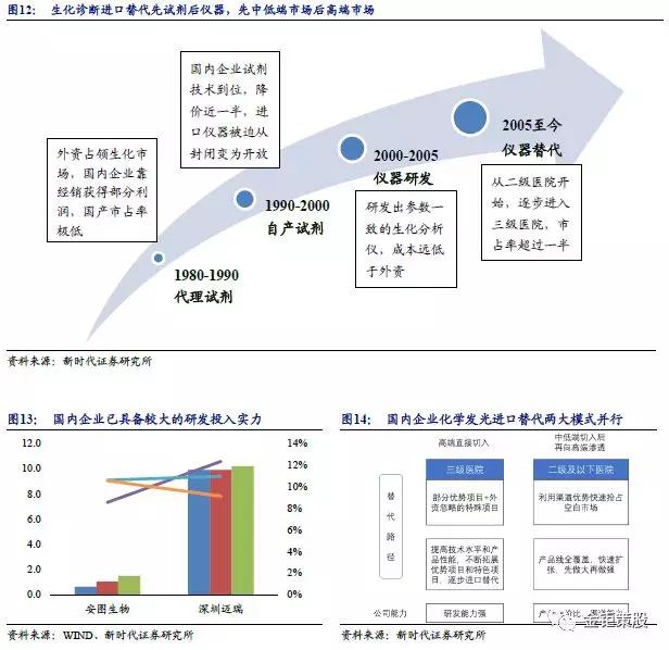 生化診斷發(fā)展早,試劑進口替代率已超60%。生化診斷也經(jīng)歷了從外資壟斷向國內(nèi)主導的進口替代發(fā)展歷程。80-90年代外資即進入了中國占據(jù)了國內(nèi)市場,國內(nèi)企業(yè)技術(shù)基礎差只能通過經(jīng)銷外資產(chǎn)品來獲取收益,國內(nèi)生化市場基本被外資壟斷。由于生化診斷儀器和試劑的封閉性相對不強,國內(nèi)企業(yè)通過技術(shù)研發(fā)開發(fā)出了相應的試劑從而開啟了進口替代的進程。