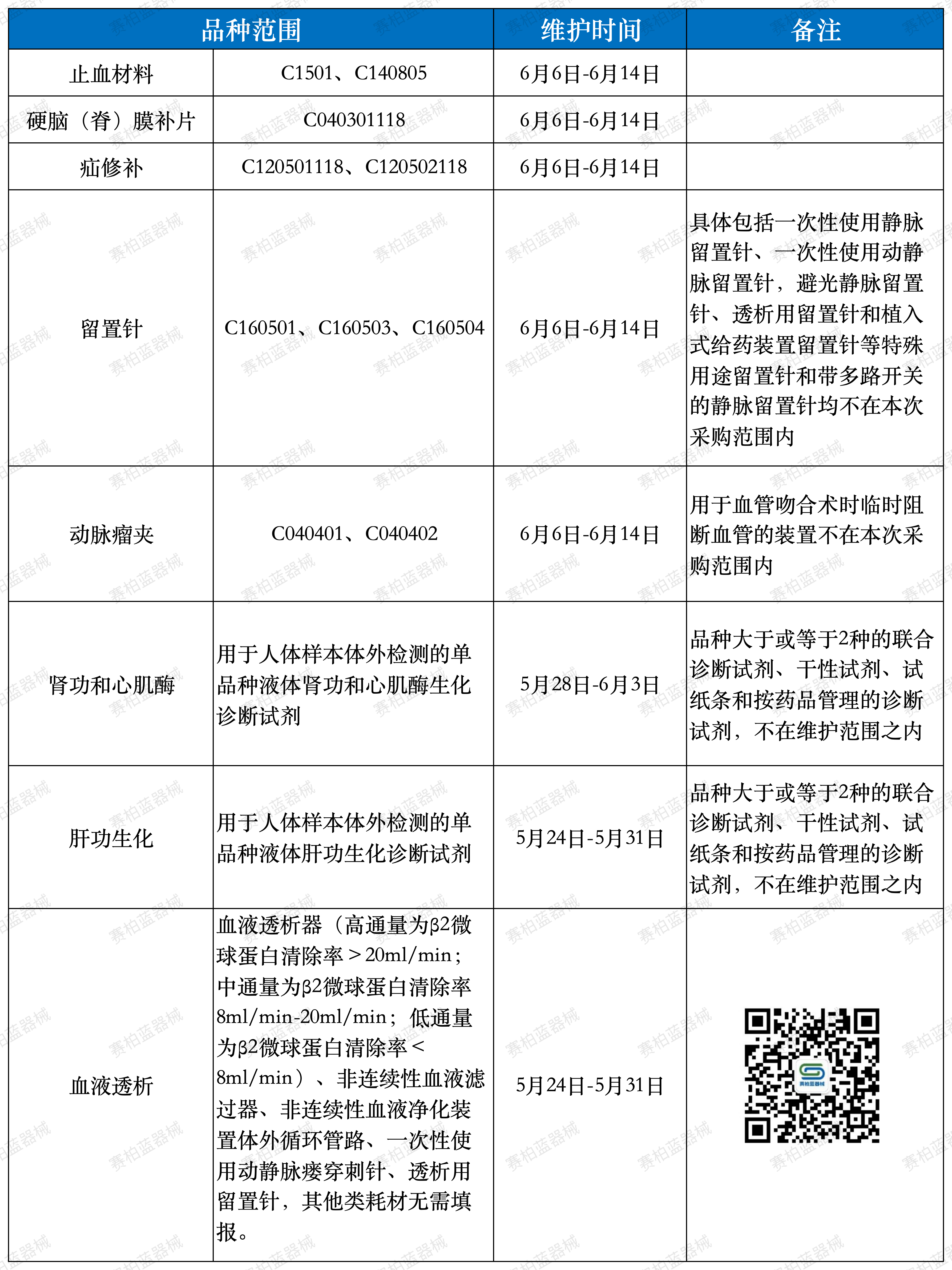 除了上述五類耗材,日前該平臺(tái)還發(fā)布了關(guān)于血液透析類、肝功生化試劑、腎功和心肌酶生化試劑開(kāi)展信息維護(hù)的通知(詳見(jiàn)《四大耗材品種集采擴(kuò)圍》),綜合整理如下: