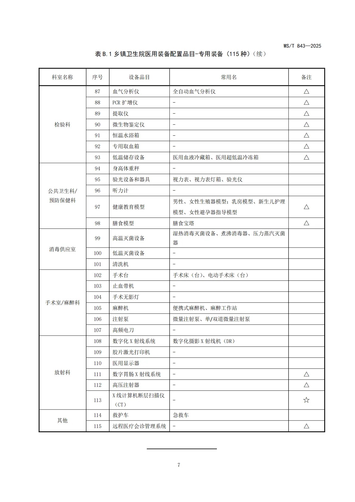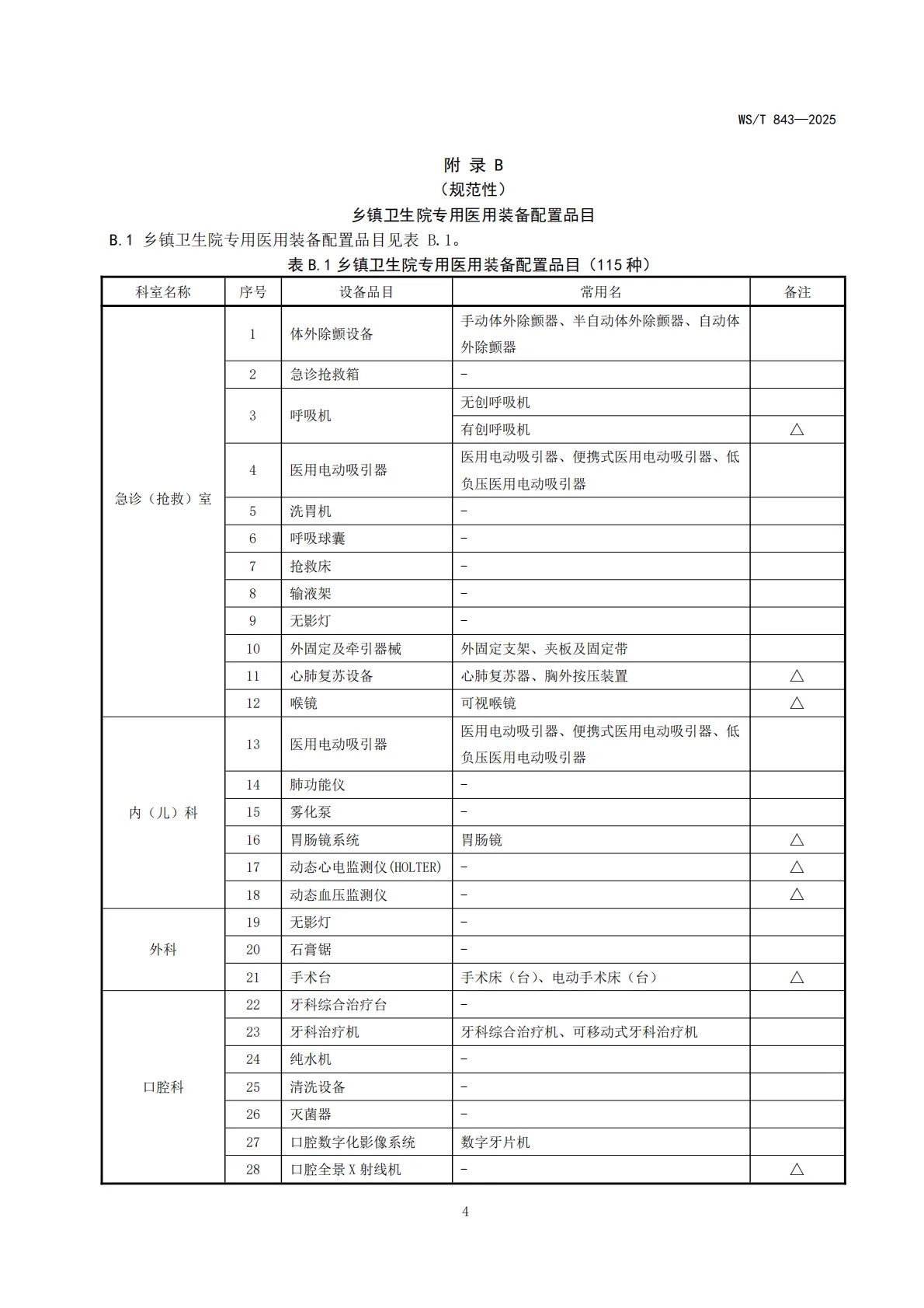 4月1日,國家衛(wèi)健委發(fā)布《鄉(xiāng)鎮(zhèn)衛(wèi)生院醫(yī)用裝備配置標(biāo)準(zhǔn)》,明確自2025年10月1日起施行新版標(biāo)準(zhǔn)。其中包括無創(chuàng)血壓測量設(shè)備、監(jiān)護(hù)設(shè)備、心電圖機(jī)、超聲診斷儀等22種通用醫(yī)用裝備,以及涵蓋急診(搶救)室、內(nèi)(兒)科、外科、口腔科、康復(fù)醫(yī)療科、全科醫(yī)療科、檢驗科等16個科室的115種專用裝備,為基層醫(yī)療設(shè)備配置提供了清晰的標(biāo)準(zhǔn)。