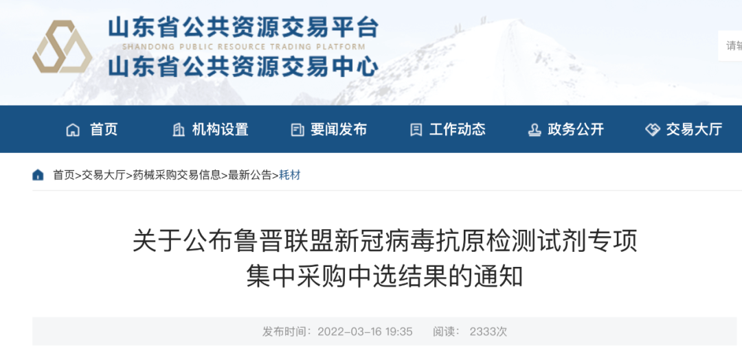 3月16日, 山東省公共資源交易中心公布《關(guān)于公布魯晉聯(lián)盟新冠病毒抗原檢測(cè)試劑專項(xiàng)集中采購(gòu)中選結(jié)果的通知》(以下簡(jiǎn)稱《通知》)。