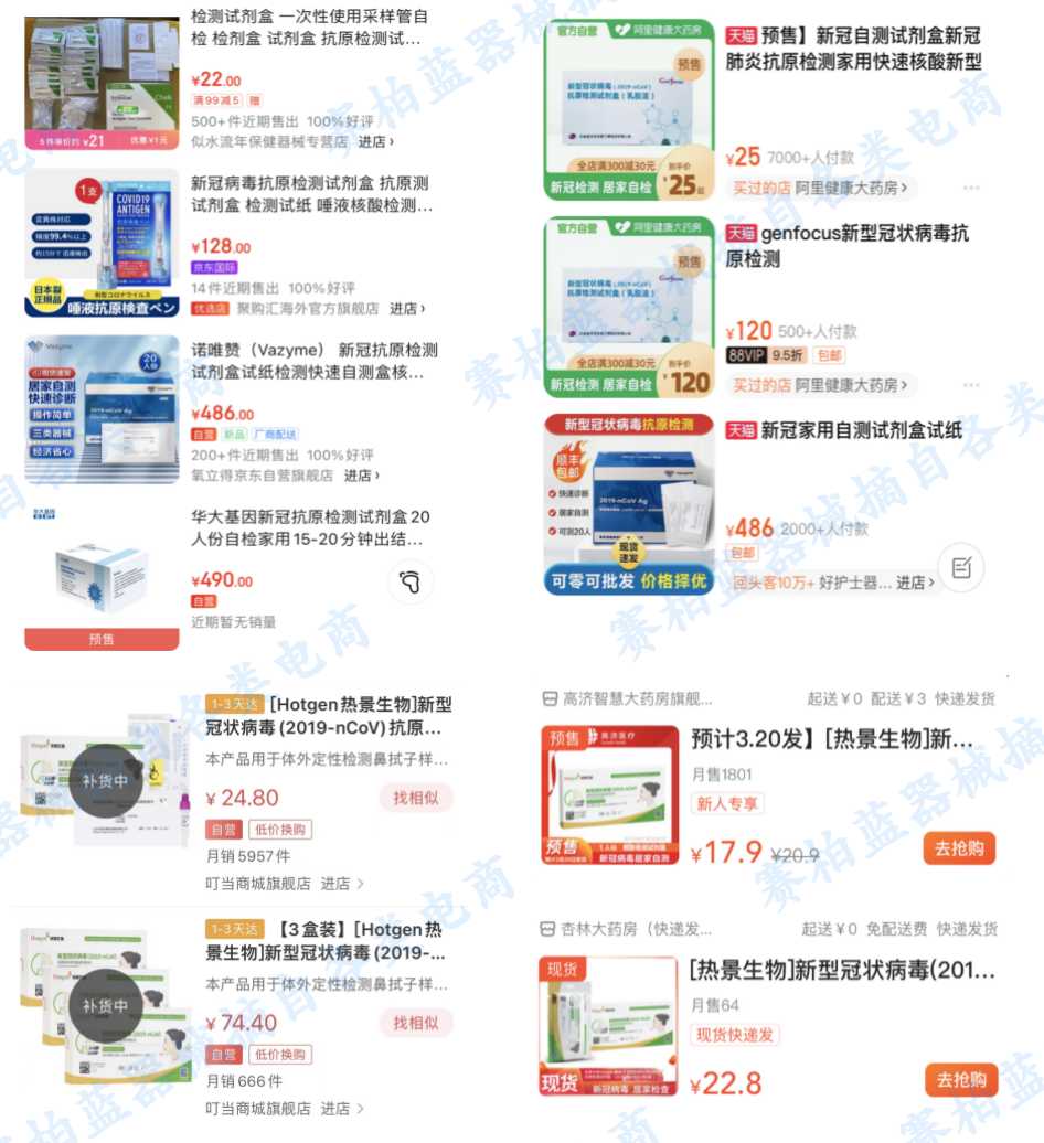 目前,線上線下醫(yī)藥零售平臺(tái)紛紛上架自測(cè)產(chǎn)品,各大品牌的上市出貨時(shí)間不一,價(jià)格也不同。有的是預(yù)售,有的可現(xiàn)貨速發(fā)。而有的已經(jīng)售罄,正在加急配貨中。
