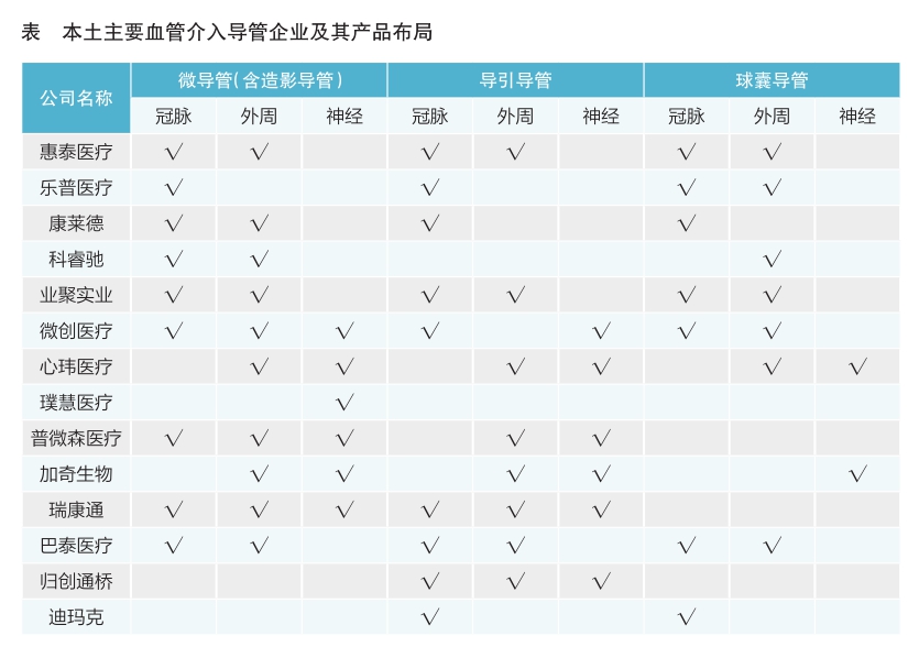 國內(nèi)企業(yè)中,微創(chuàng)醫(yī)療(含下屬企業(yè))的血管介入導管產(chǎn)品布局較為全面,覆蓋冠脈介入、外周血管介入、神經(jīng)血管介入等各個領域;惠泰醫(yī)療、業(yè)聚實業(yè)、巴泰醫(yī)療等企業(yè)在冠脈介入、外周血管介入治療領域有較全面的產(chǎn)品布局;心瑋醫(yī)療在外周血管介入、神經(jīng)血管介入領域的布局較為全面;樂普醫(yī)療、康德萊主要在冠脈介入領域布局(詳見表)。
