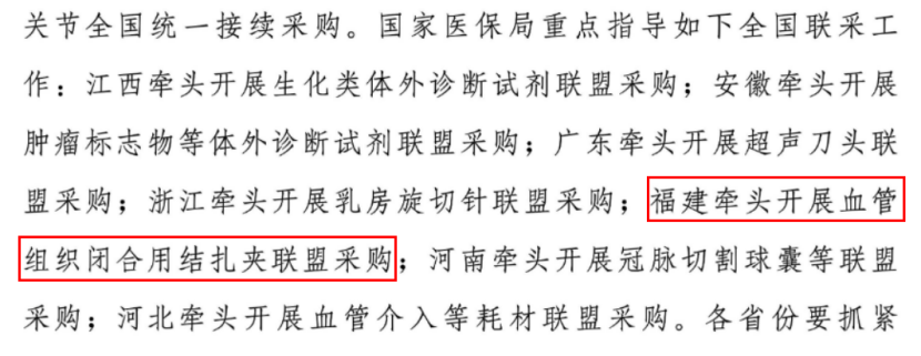 就在兩天前,國家醫(yī)保局最新醫(yī)藥集采文件《國家醫(yī)療保障局辦公室關于加強區(qū)域協(xié)同做好2024年醫(yī)藥集中采購提質擴面的通知》中正式敲定了七大耗材全國聯(lián)采,福建血管組織閉合用結扎夾就是其中之一。