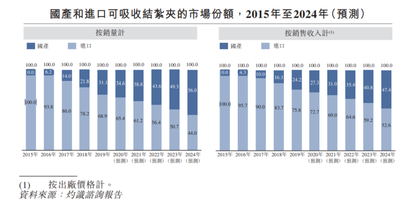 據(jù)灼識咨詢報告,預計到2024年中國結扎夾市場規(guī)模將達到40.86億元,其中高分子結扎夾市場規(guī)模28.33億元,2020-2024年復合增長率達25.2%,可吸收結扎夾市場規(guī)模12.53億元,2020-2024年復合增長率達29.2%。國產(chǎn)替代趨勢較為明顯。
