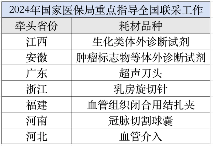根據(jù)國家醫(yī)保局前述文件,國家醫(yī)保局將重點指導如下全國聯(lián)采工作:江西牽頭開展生化類體外診斷試劑聯(lián)盟采購;安徽牽頭開展腫瘤標志物等體外診斷試劑聯(lián)盟采購;廣東牽頭開展超聲刀頭聯(lián)盟采購;浙江牽頭開展乳房旋切針聯(lián)盟采購;福建牽頭開展血管組織閉合用結扎夾聯(lián)盟采購;河南牽頭開展冠脈切割球囊等聯(lián)盟采購;河北牽頭開展血管介入等耗材聯(lián)盟采購。