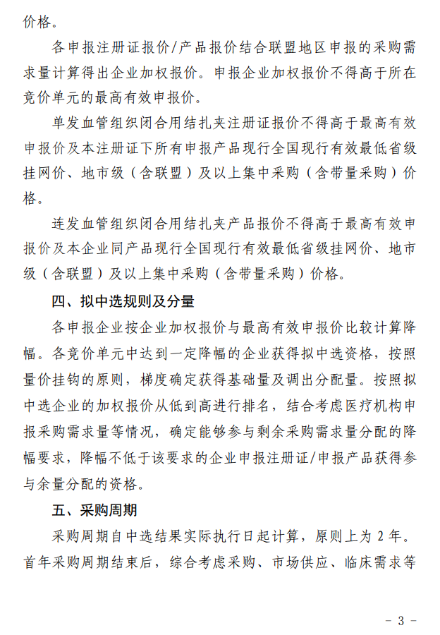各競價單元中達到一定降幅的企業(yè)獲得擬中選資格,按照量價掛鉤的原則,梯度確定獲得基礎量及調出分配量。按照擬中選企業(yè)的加權報價從低到高進行排名,結合考慮醫(yī)療機構申報采購需求量等情況,確定能夠參與剩余采購需求量分配的降幅要求,降幅不低于該要求的企業(yè)申報注冊證/申報產(chǎn)品獲得參與余量分配的資格。