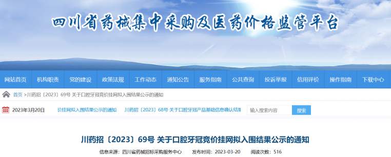 今日(3月20日),四川省藥械招標采購服務中心發(fā)布《關于口腔牙冠競價掛網(wǎng)擬入圍結果公示的通知》
