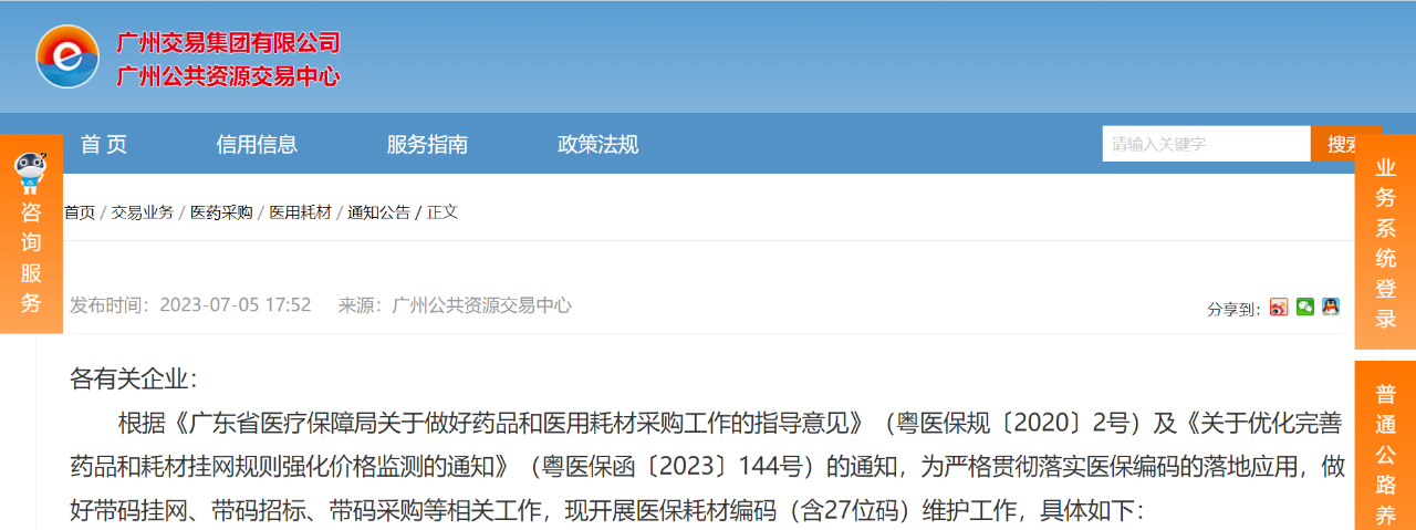 7月5日,廣東省廣州公共資源交易中心也發(fā)布了《關(guān)于開(kāi)展產(chǎn)品醫(yī)保耗材編碼更新維護(hù)工作的通知》。
