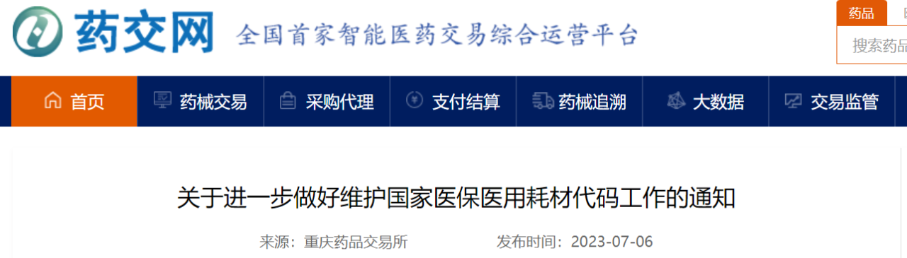 7月6日,重慶藥品交易所發(fā)布《關(guān)于進(jìn)一步做好維護(hù)國(guó)家醫(yī)保醫(yī)用耗材代碼工作的通知》。