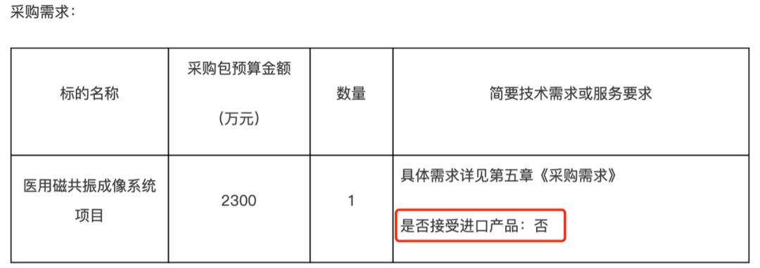 公告稱,中國醫(yī)學院腫瘤醫(yī)院預算2300萬采購醫(yī)用磁共振成像系統(tǒng),表示不接受進口產(chǎn)品。