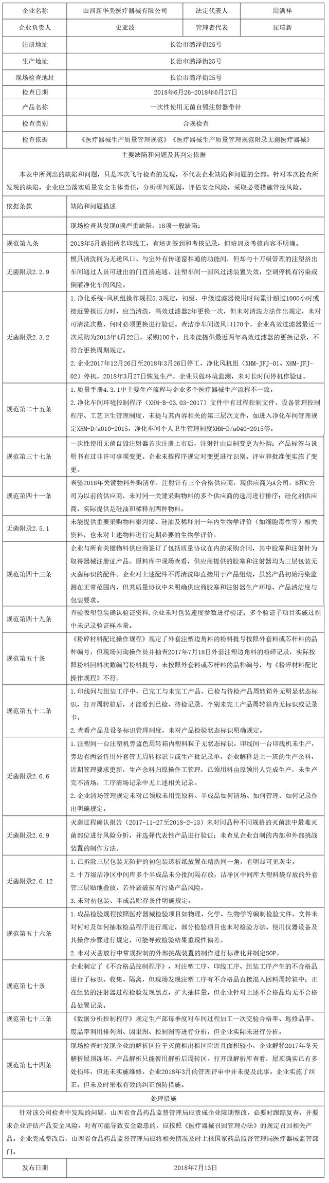 對山西新華美醫(yī)療器械有限公司公司飛行檢查通報