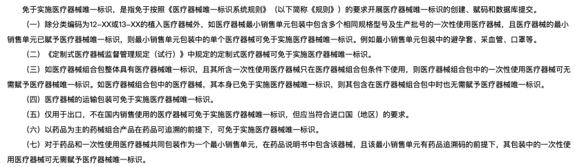 根據(jù)同日發(fā)布的《國家藥監(jiān)局關于特定情形實施醫(yī)療器械唯一標識有關事項的公告》,部分情形免于實施醫(yī)療器械唯一標識,具體如下: