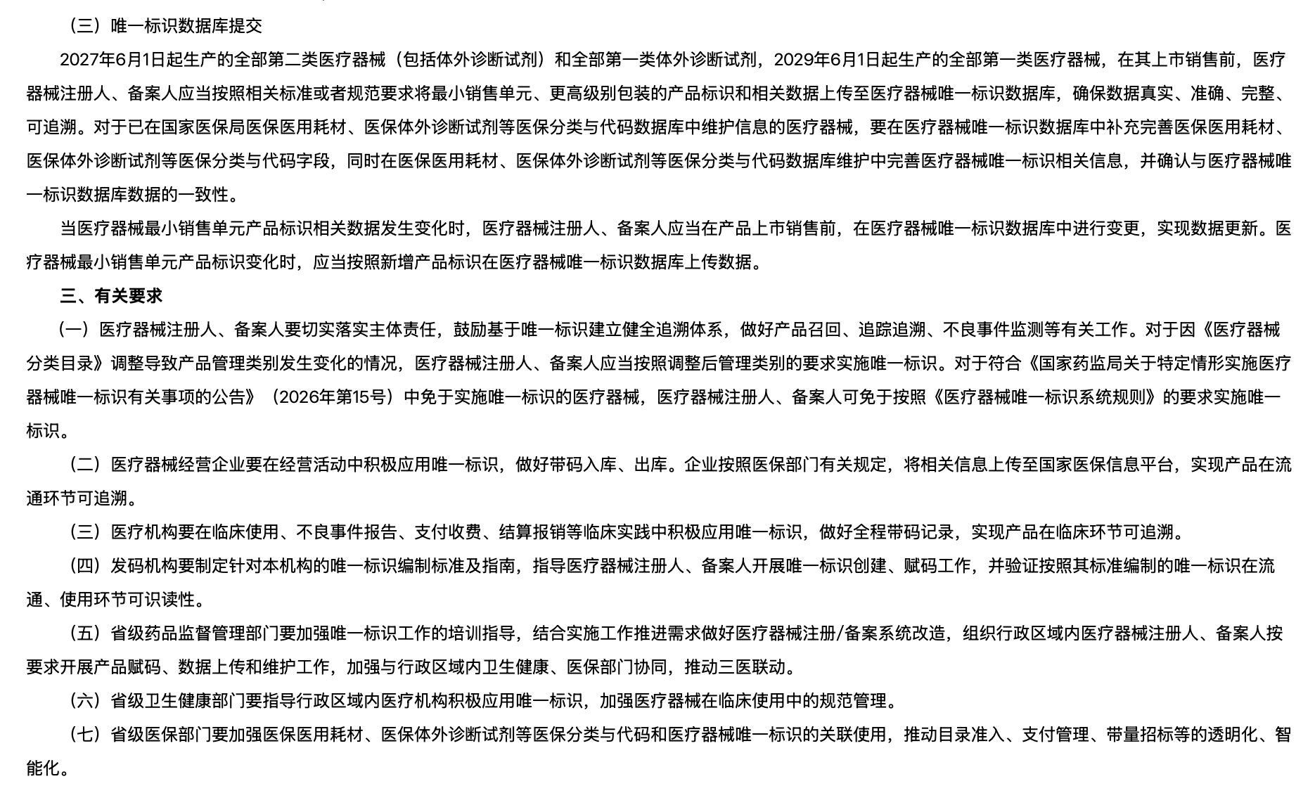 2029年6月1日起生產的全部第一類醫(yī)療器械應當具有醫(yī)療器械唯一標識。2029年6月1日前生產的上述品種產品可不具有唯一標識。