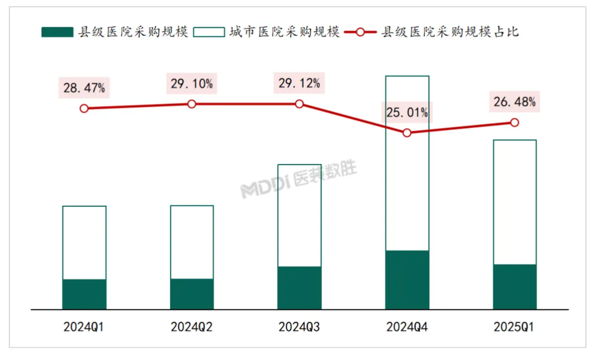 (2024-2025年3月國(guó)內(nèi)公立醫(yī)院醫(yī)療設(shè)備采購(gòu)規(guī)模及縣級(jí)醫(yī)院占比季度變化)