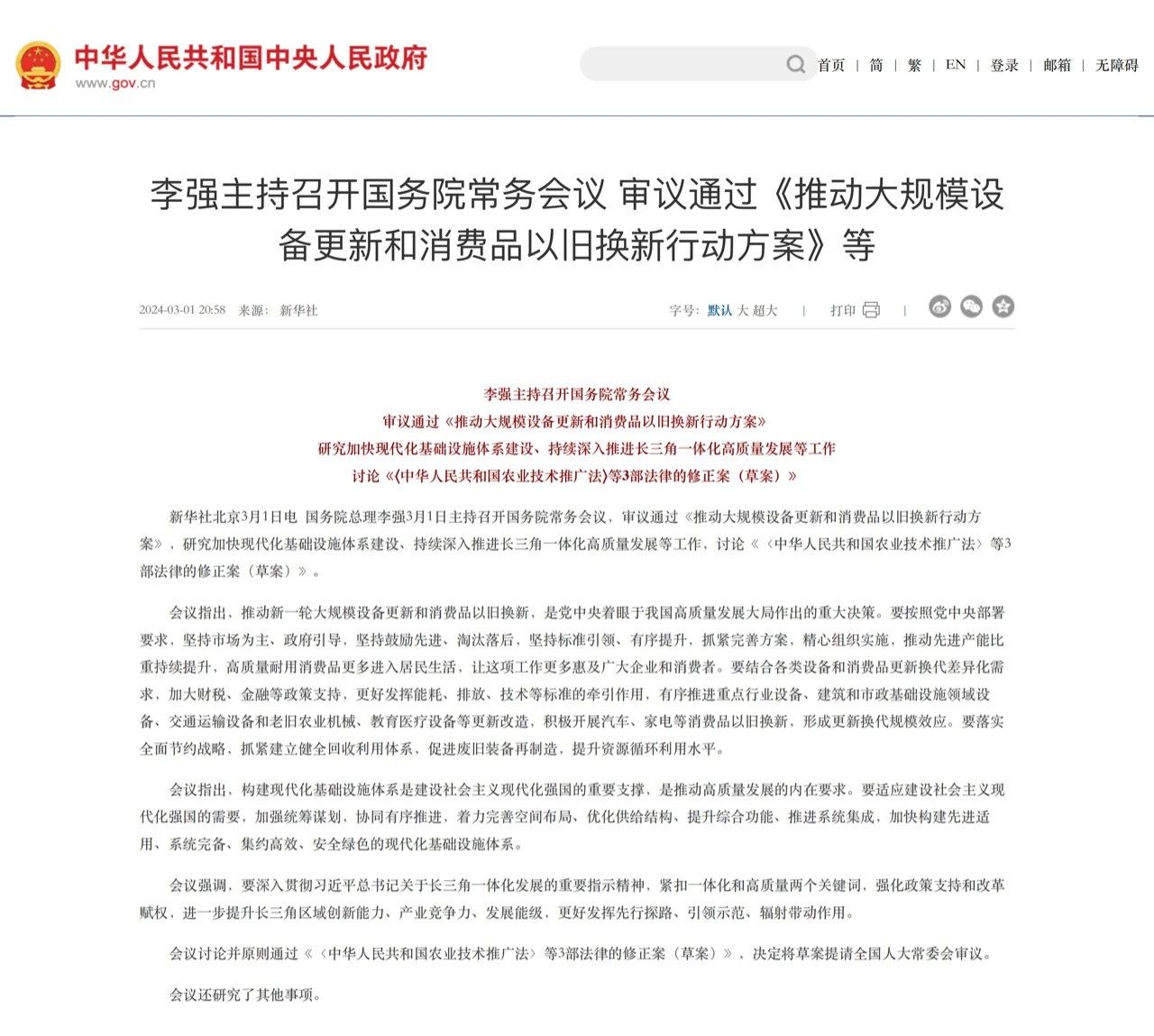 新華社報道,國務院總理李強3月1日主持召開國務院常務會議,審議通過《推動大規(guī)模設備更新和消費品以舊換新行動方案》,研究加快現(xiàn)代化基礎設施體系建設、持續(xù)深入推進長三角一體化高質(zhì)量發(fā)展等工作,討論《〈中華人民共和國農(nóng)業(yè)技術(shù)推廣法〉等3部法律的修正案(草案)》。