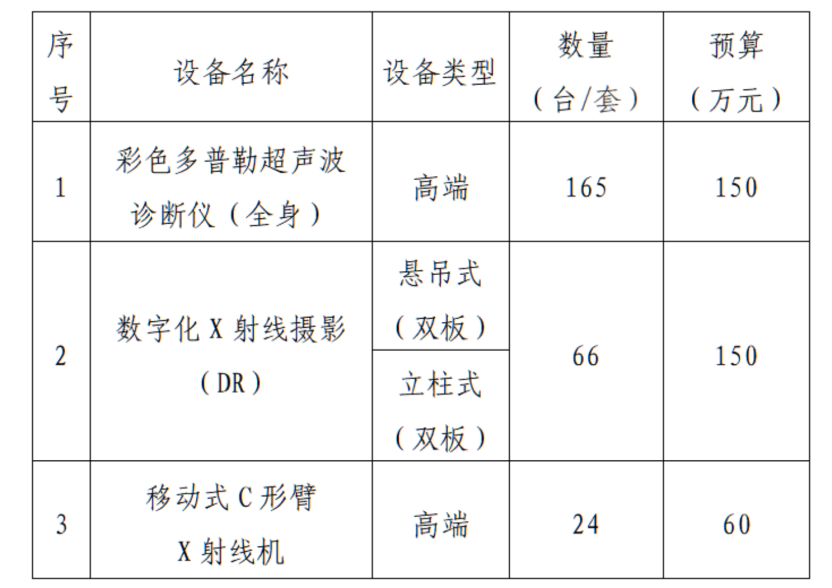 本周內(nèi),廣東、河南、江西、山西、湖北、云南等多地醫(yī)療設(shè)備更新有新消息。近期,山西省衛(wèi)健委擬于近期組織專家召開設(shè)備采購需求參數(shù)論證會,并開始征集設(shè)備采購需求參數(shù)意見。從需求清單來看,彩超、DR等設(shè)備需求量較大,總預(yù)算達3.6億元。