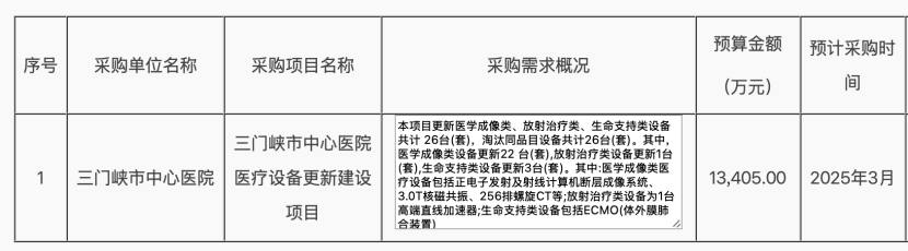 河南三門峽市中心醫(yī)院醫(yī)療設(shè)備更新建設(shè)項目預(yù)計本月采購,該項目將更新設(shè)備26臺(套),包括ECMO、高端直線加速器、3.0T磁共振、256排螺旋CT等高端設(shè)備,預(yù)算金額1.34億元。
