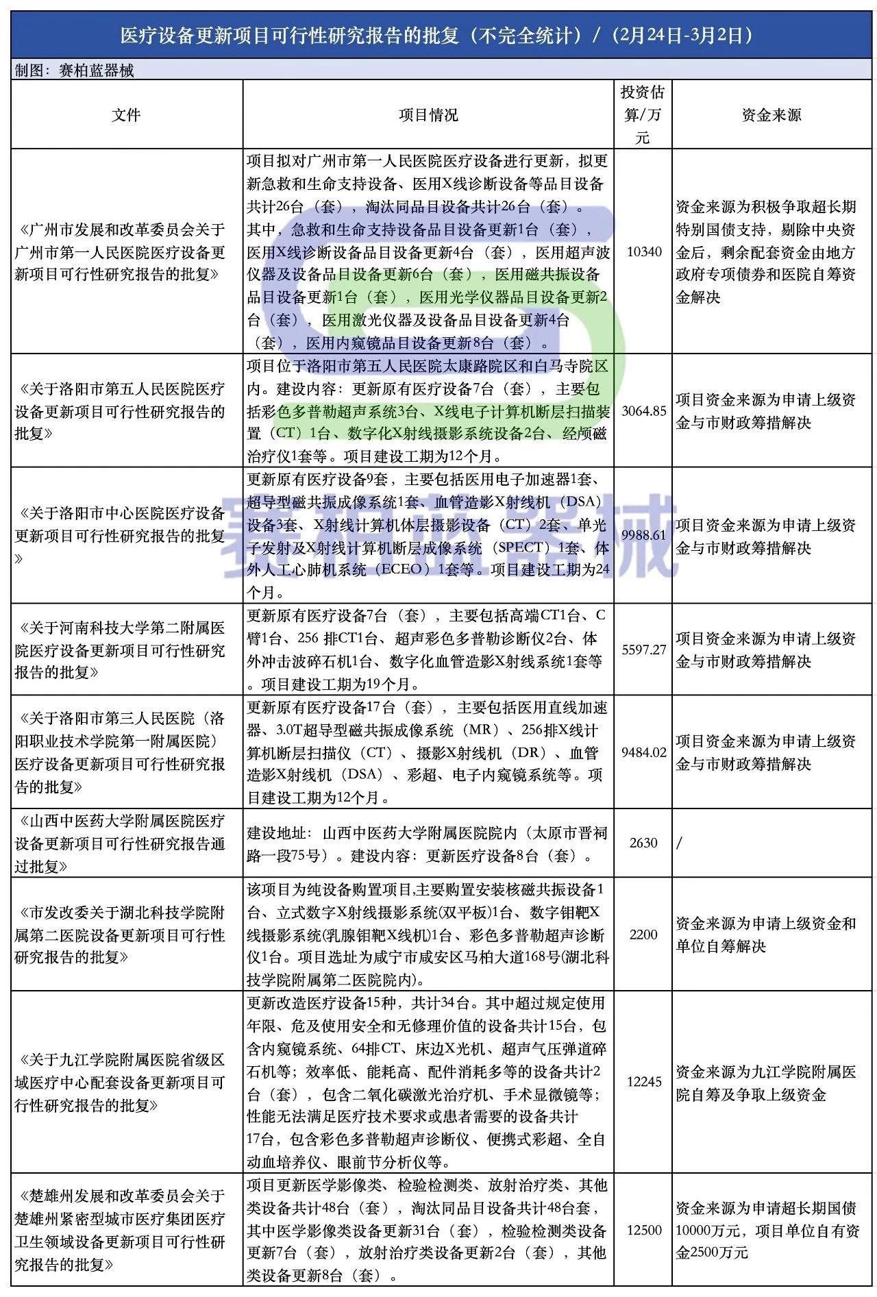 除上述項目外,本周內(nèi)還有多地公布了對于相關(guān)醫(yī)療設(shè)備更新項目可行性研究報告的批復(fù),具體包括廣州市第一人民醫(yī)院、洛陽市第五人民醫(yī)院、洛陽市中心醫(yī)院、河南科技大學(xué)第二附屬醫(yī)院、洛陽市第三人民醫(yī)院(洛陽職業(yè)技術(shù)學(xué)院第一附屬醫(yī)院)、山西中醫(yī)藥大學(xué)附屬醫(yī)院、湖北科技學(xué)院附屬第二醫(yī)院、九江學(xué)院附屬醫(yī)院、楚雄州緊密型城市醫(yī)療集團等醫(yī)療設(shè)備更新項目。
