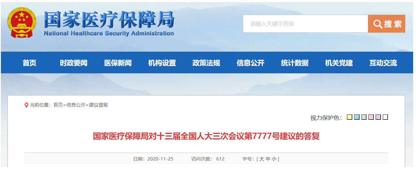 11月25日,國家醫(yī)保局發(fā)布《國家醫(yī)療保障局對十三屆全國人大三次會議第7777號建議的答復(fù)》(下稱《7777號答復(fù)》)。