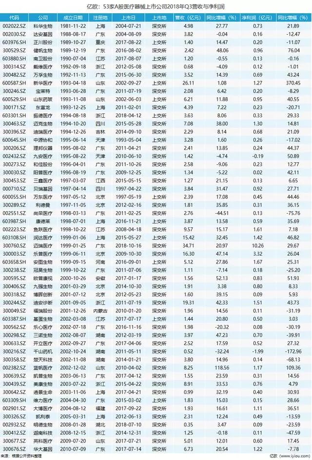 近期,隨著A股市場(chǎng)先后披露2018年第三季度報(bào)告,國(guó)內(nèi)上市企業(yè)醫(yī)療器械業(yè)績(jī)版圖呼之欲出。通過(guò)Choice金融終端檢索的數(shù)據(jù),制成A股醫(yī)療器械上市公司Q3營(yíng)收與凈利潤(rùn)信息一覽表,以期窺見(jiàn)行業(yè)發(fā)展現(xiàn)狀。