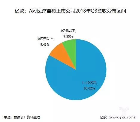 將A股醫(yī)療器械上市公司2018年Q3營(yíng)收分為三個(gè)區(qū)間,分別是1億元以下、1~10億元、10億元以上,對(duì)應(yīng)的占比為依次為7.55%(4家)、83.02%(44家)、9.43%(5家)。其中,1~10億元區(qū)間里,營(yíng)收范圍在1~5億元的企業(yè)有36家??傮w而言,各區(qū)間之間呈現(xiàn)明顯的梯度差異。