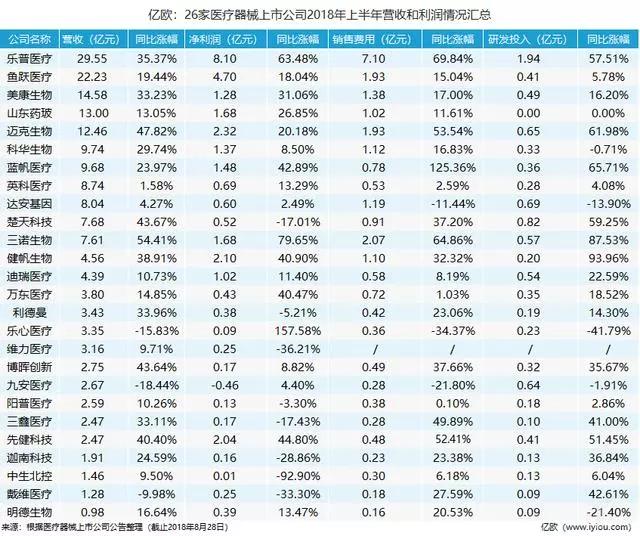 近期,醫(yī)療器械上市公司陸續(xù)發(fā)布2018年半年度報告。億歐大健康統(tǒng)計后發(fā)現(xiàn),截止8月28日,已經(jīng)有26家醫(yī)療器械上市公司發(fā)布了2018年半年度報告,這26家公司總營收為184.58億元,同比增長21.10%;總凈利潤為31.55億元,同比增長15.16%;總銷售費用為25.92億元,同比增長24.18%;總研發(fā)投入費用為10.14億元,同比增長24.78%??備N售費用明顯高于總研發(fā)投入費用,可見國內(nèi)醫(yī)療器械行業(yè)仍然是銷售主導(dǎo)型。